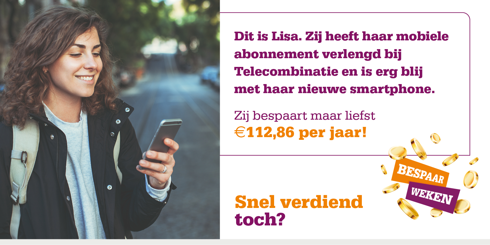 Het zijn Bespaarweken bij Telecombinatie. De energietarieven stijgen, de benzineprijzen gaan door het dak en aan de kassa bij de supermarkt betaal je steeds meer, maar niet bij ons. Tijdens de Bespaarweken zorgen we ervoor dat jij per maand gaat besparen op het bedrag voor je mobiele abonnement én Internet & TV.