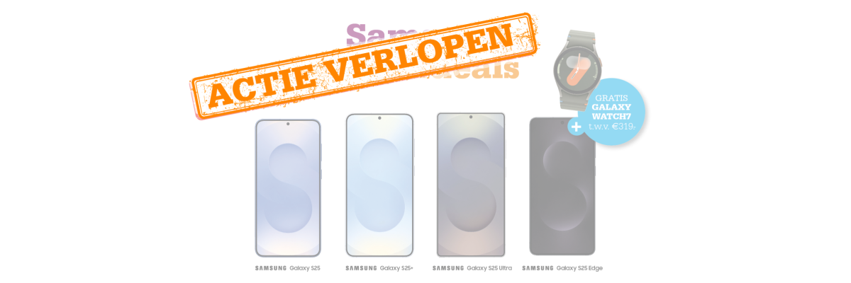 Dit jaar heeft Samsung de nieuwste topserie van hun smartphones geïntroduceerd: de Samsung Galaxy S25-serie! Houd jij die Samsung S25 al een tijdje in de gaten? Sla dan nu je slag bij Telecombinatie en beloon jezelf daarbij ook nog eens met een gratis Samsung Galaxy Watch7 t.w.v. €319 bij aankoop van één van de volgende Samsung toestellen: